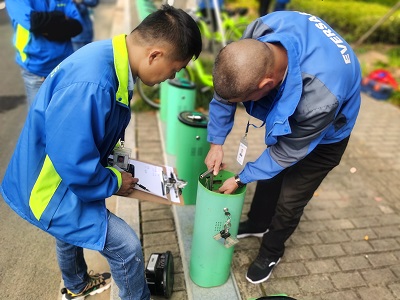 那邊比賽,師傅們紛紛伸手在綠色樁體內(nèi)“摸魚(yú)”。站點(diǎn)設(shè)備維修技能比賽是今年新增的項(xiàng)目,重點(diǎn)檢查公共自行車(chē)的鎖車(chē)及解鎖一體樁使用是否正常、站點(diǎn)底板是否銹蝕、鎖車(chē)及解鎖系統(tǒng)是否損壞等方面。