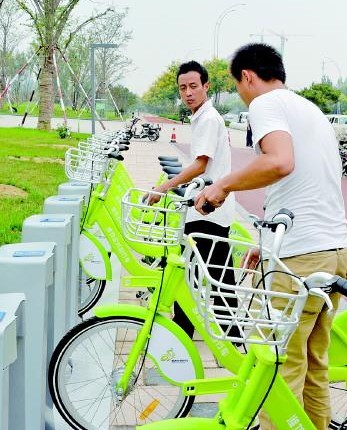 山東濰坊市民在人民廣場公共自行車站點試騎。