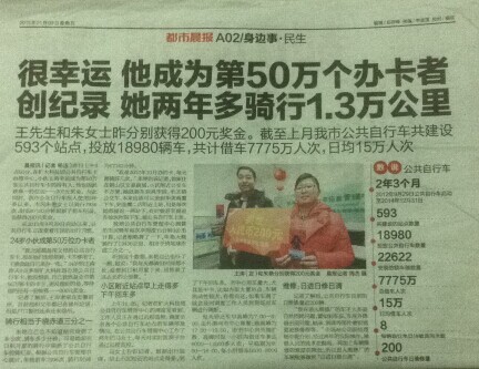 “我之前都是用父母的公共自行車卡,現(xiàn)在他們也經(jīng)常騎,卡不夠用了,干脆我就自己來辦一張?!?4歲的王濤昨天9點多到礦大科技園辦理公共自行車卡,他沒想到,自己竟然是全市第50萬張卡的卡主,更沒想到的是,等待他的還有一份驚喜———200元獎金。