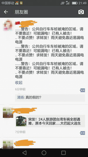 19日晚上,網(wǎng)友“清揚(yáng)”發(fā)現(xiàn)朋友圈里不時有網(wǎng)友轉(zhuǎn)發(fā)一則提醒消息,這條消息看起來很貼心,但也讓人不免產(chǎn)生恐慌心理。這條消息內(nèi)容如下:“警告:公共自行車車樁被淹的區(qū)域,請不要靠近!可能漏電!已有人被擊!不要點(diǎn)贊,求轉(zhuǎn)發(fā)!雨天避免靠近易漏電電源?!迸笥讶D(zhuǎn)發(fā)這條內(nèi)容時,有人還配上公共自行車的圖,有的是將上面的內(nèi)容連說三遍,以引起受眾注意。