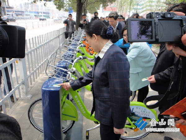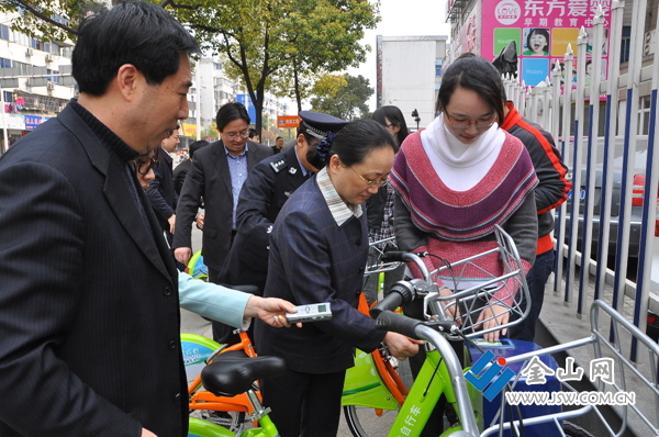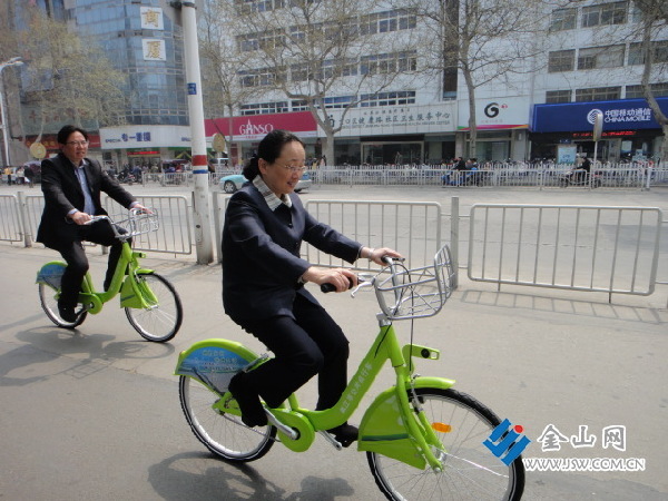 在大市口廣場(chǎng)上,朱曉明、雷志強(qiáng)一行首先閱讀了標(biāo)注有公共自行車(chē)使用方法和車(chē)位分布圖的展牌。朱曉明要求市城管部門(mén)更廣泛地宣傳使用方法和車(chē)位分布圖,讓更多市民知曉,并在試運(yùn)行的一個(gè)月中及時(shí)聽(tīng)取他們的意見(jiàn)和建議,隨時(shí)加以改進(jìn),以便5月1日正式運(yùn)行時(shí)給市民帶去更多方便。隨后,朱曉明、雷志強(qiáng)及有關(guān)部門(mén)負(fù)責(zé)人來(lái)到位于房產(chǎn)交易中心外的車(chē)位上各自取了一輛自行車(chē)騎上了解放路。